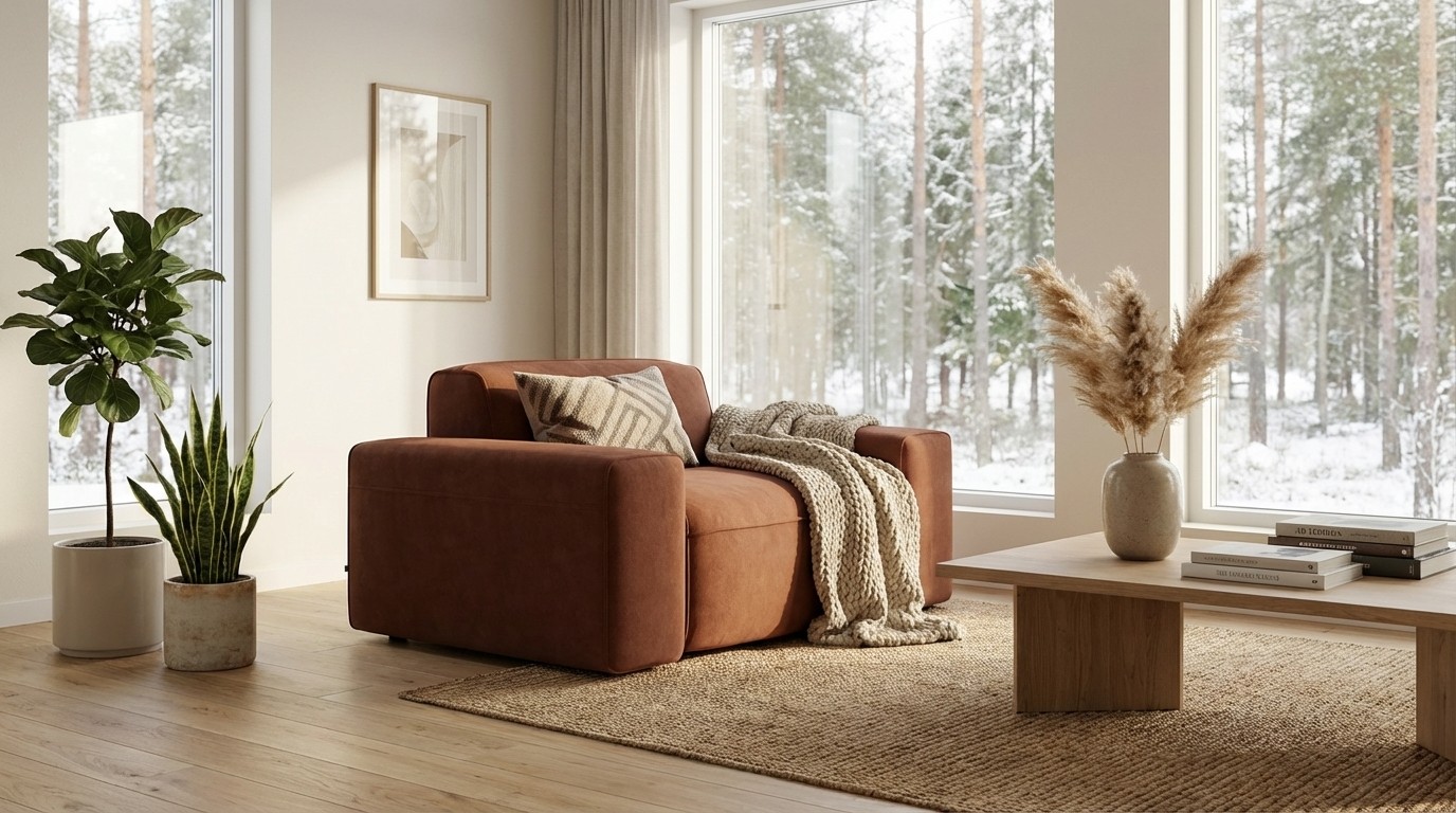 Prompt: Görselde paylaştığım koltuk için kuzey ülkelerinin tasarımlarına uygun bir hava oluştur sahnelemesinde koltuğu bu tasarıma uygun bir salona yerleştir.