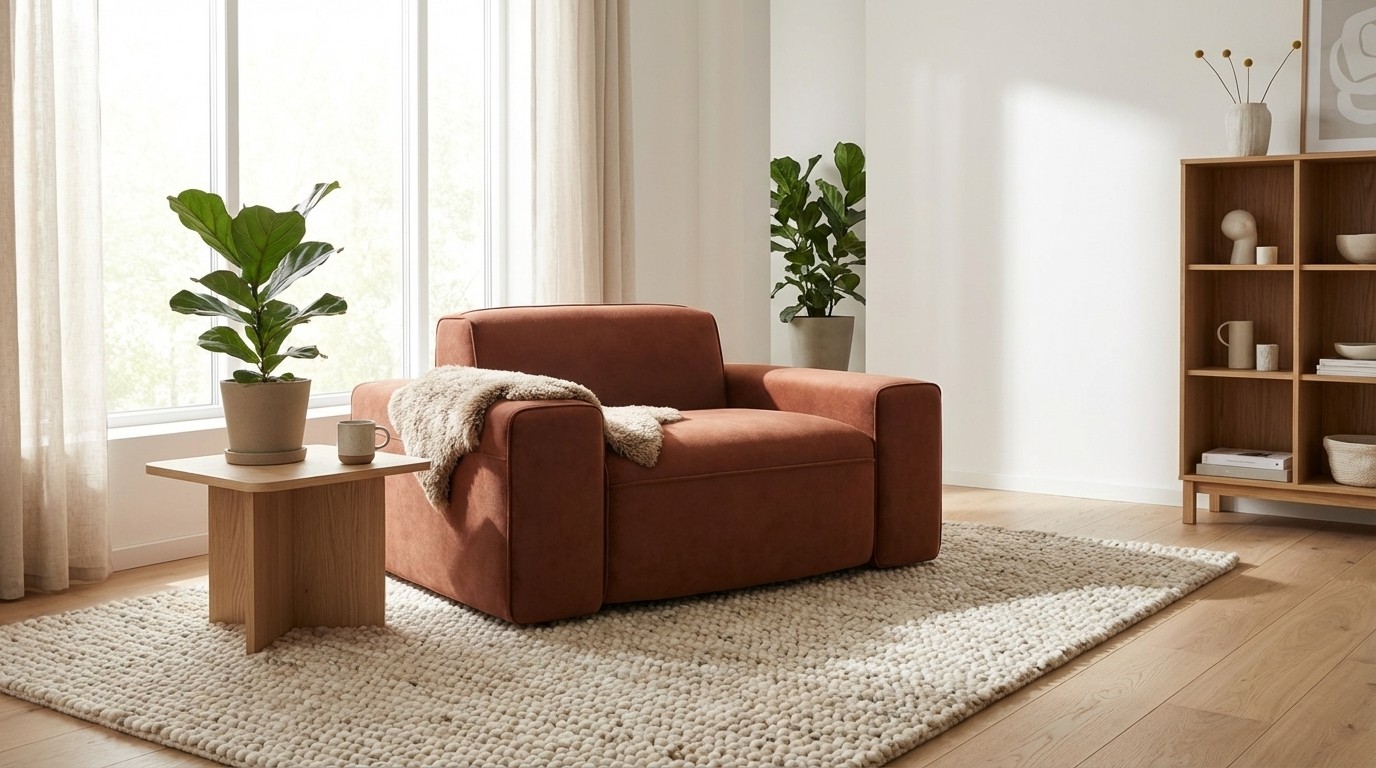 Prompt: Görselde paylaştığım koltuk ve berjeri renklerine uygun sıcak tonda salona yerleştir. Lifestyle bir sahneleme olsun.