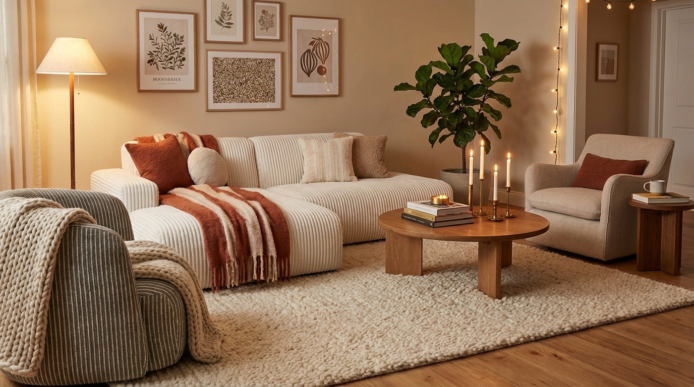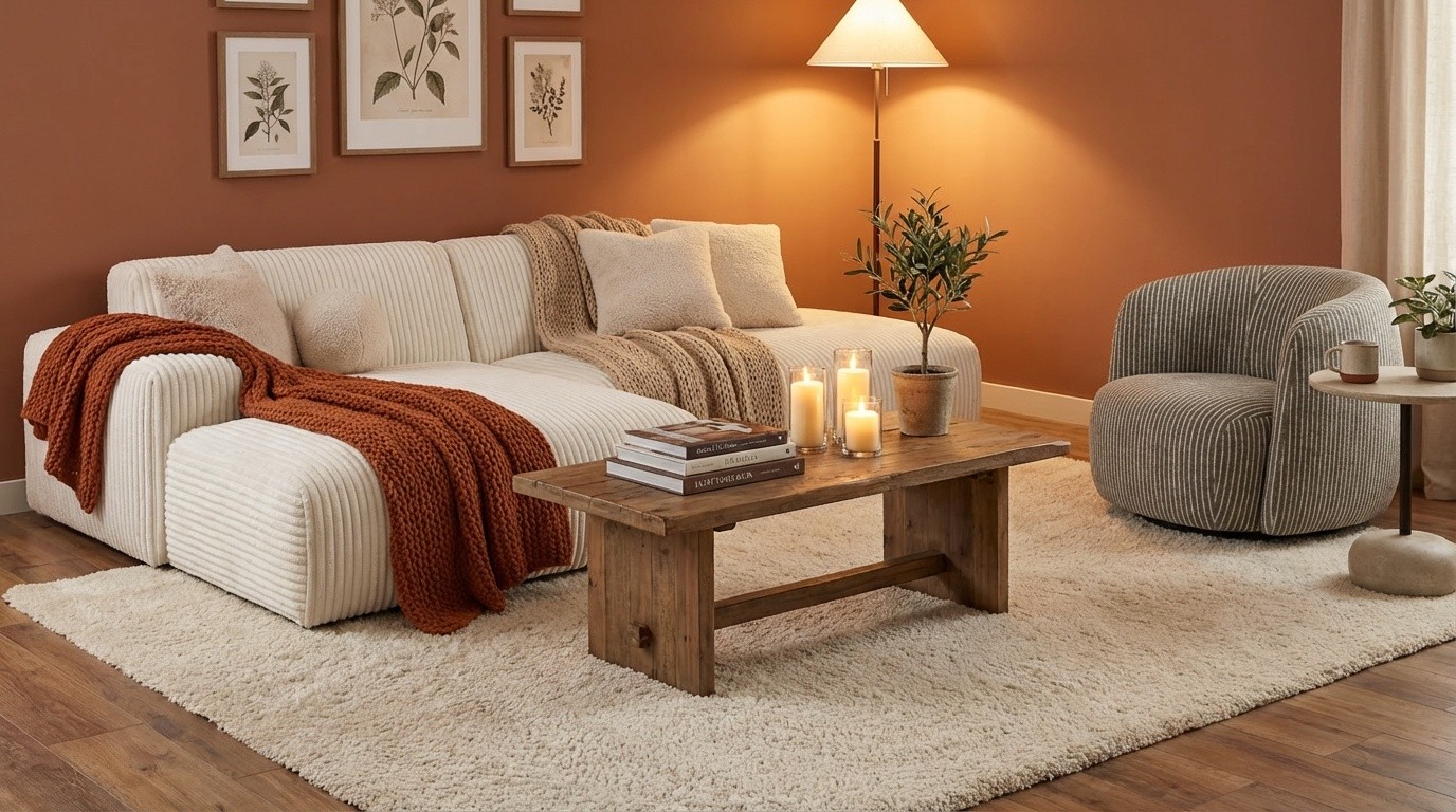 Prompt: Görselde paylaştığım koltuk ve berjeri renklerine uygun sıcak tonda salona yerleştir. Lifestyle bir sahneleme olsun.