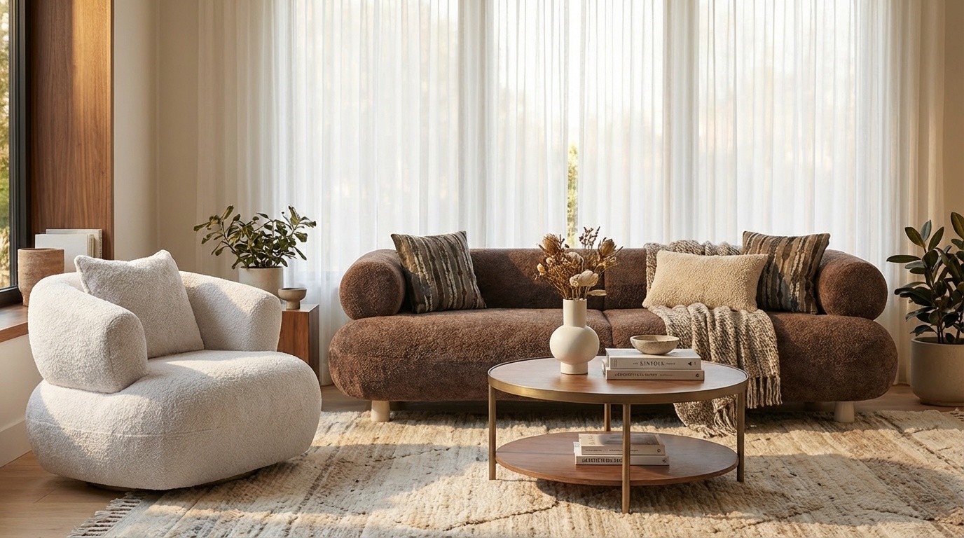 Prompt: Görselde paylaştığım koltuk ve berjeri renklerine uygun sıcak tonda salona yerleştir. Lifestyle bir sahneleme olsun.