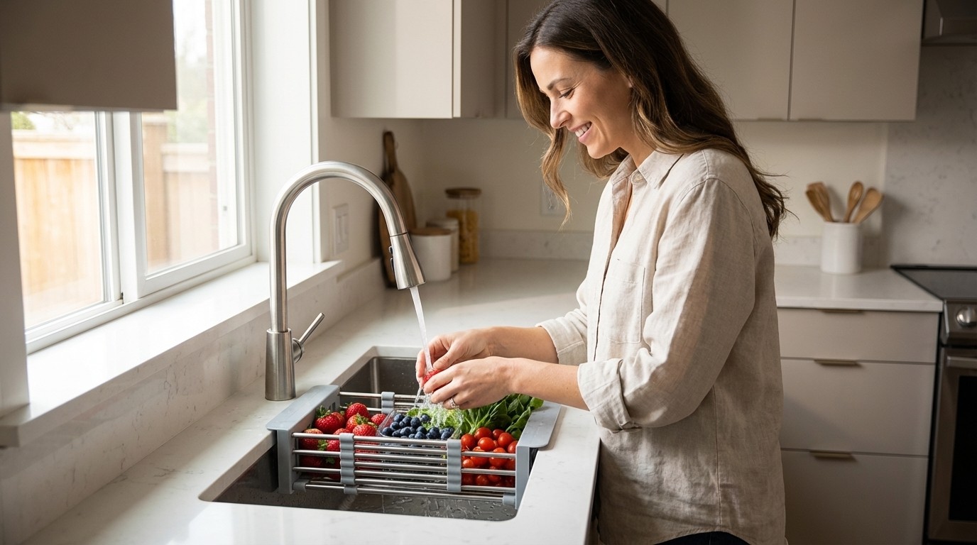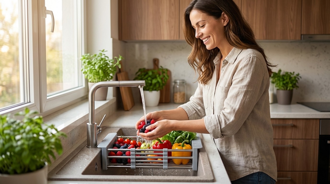 Prompt: Ürünü mutfak lavabosunun içerisine meyve sebze yerleştirerek e- ticaret görseli oluştur