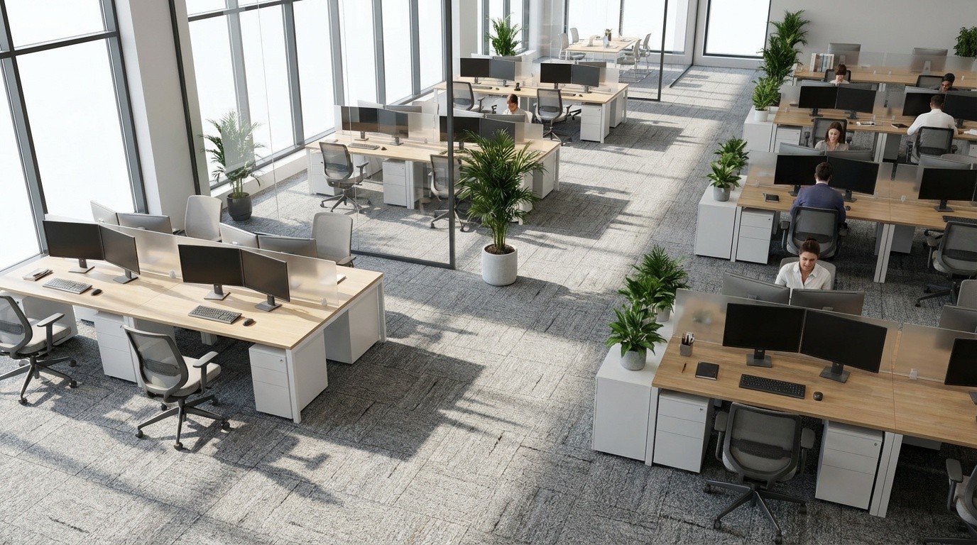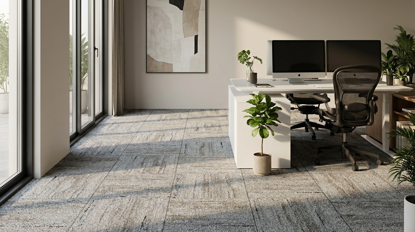 Prompt: Görseldeki 50x50cm karo zemin halısı bu halıyı ölçülerine uygun şekilde ofis ortamında sahnele