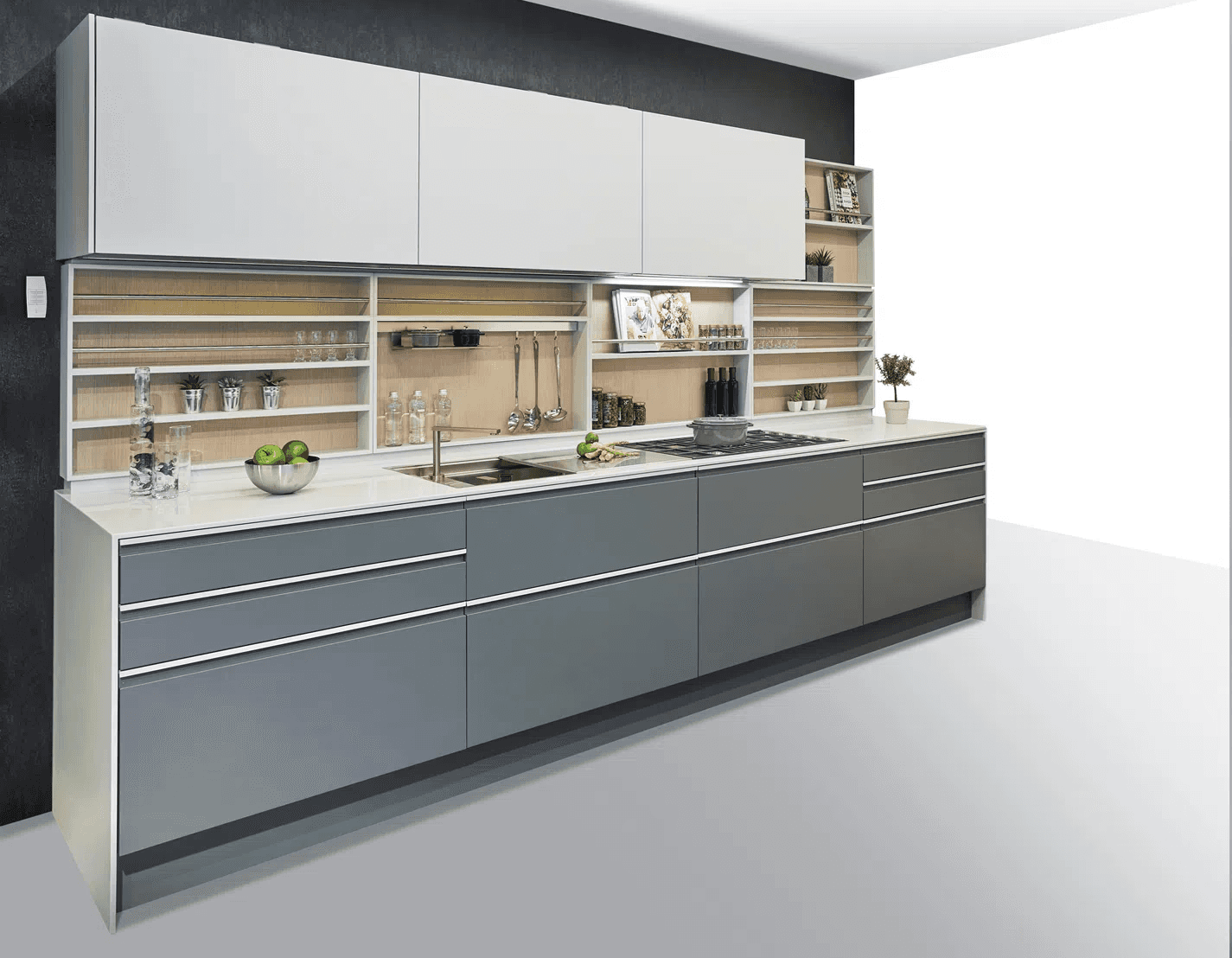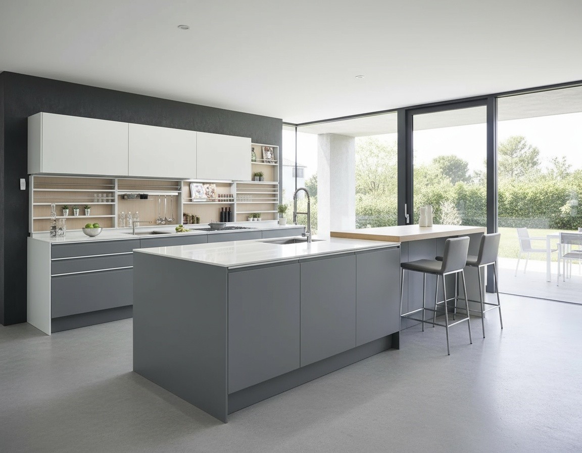 Prompt: Mutfak tasarımının önüne bir ada tezgah ekleyerek villanın içerisinde konumlandır