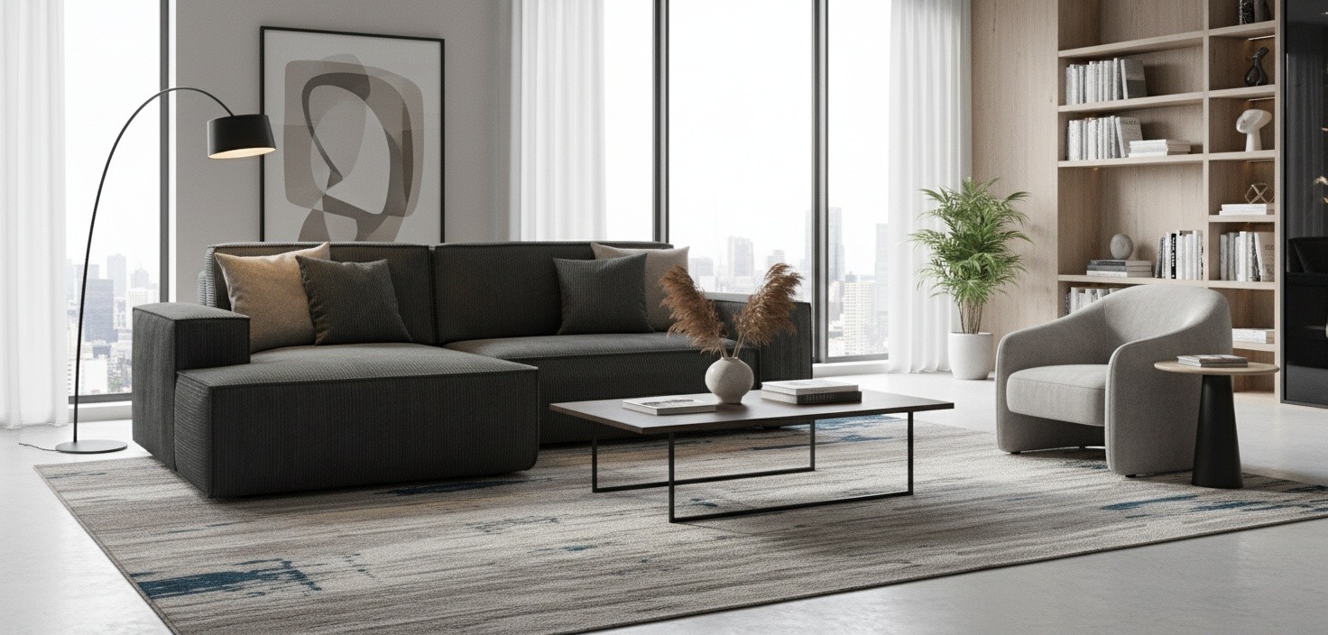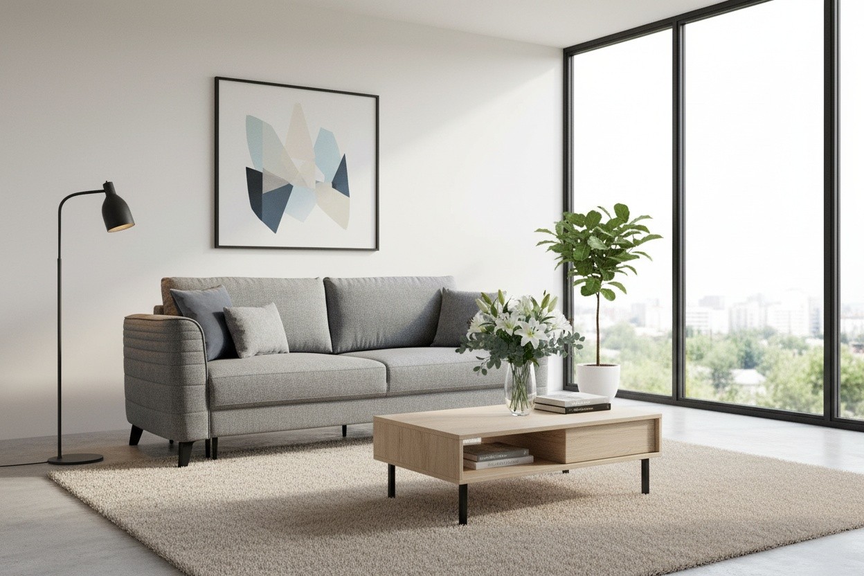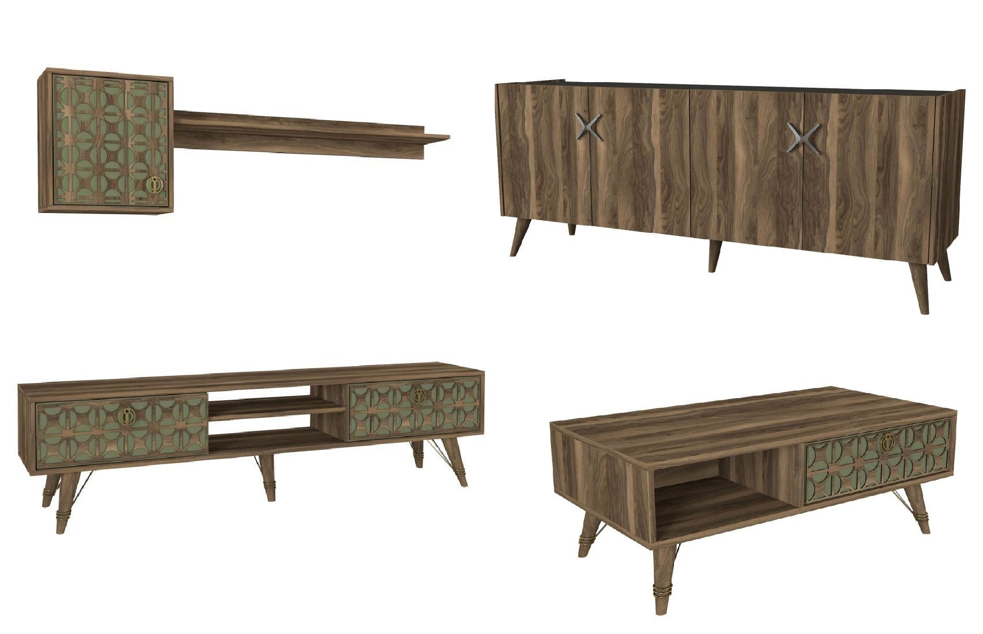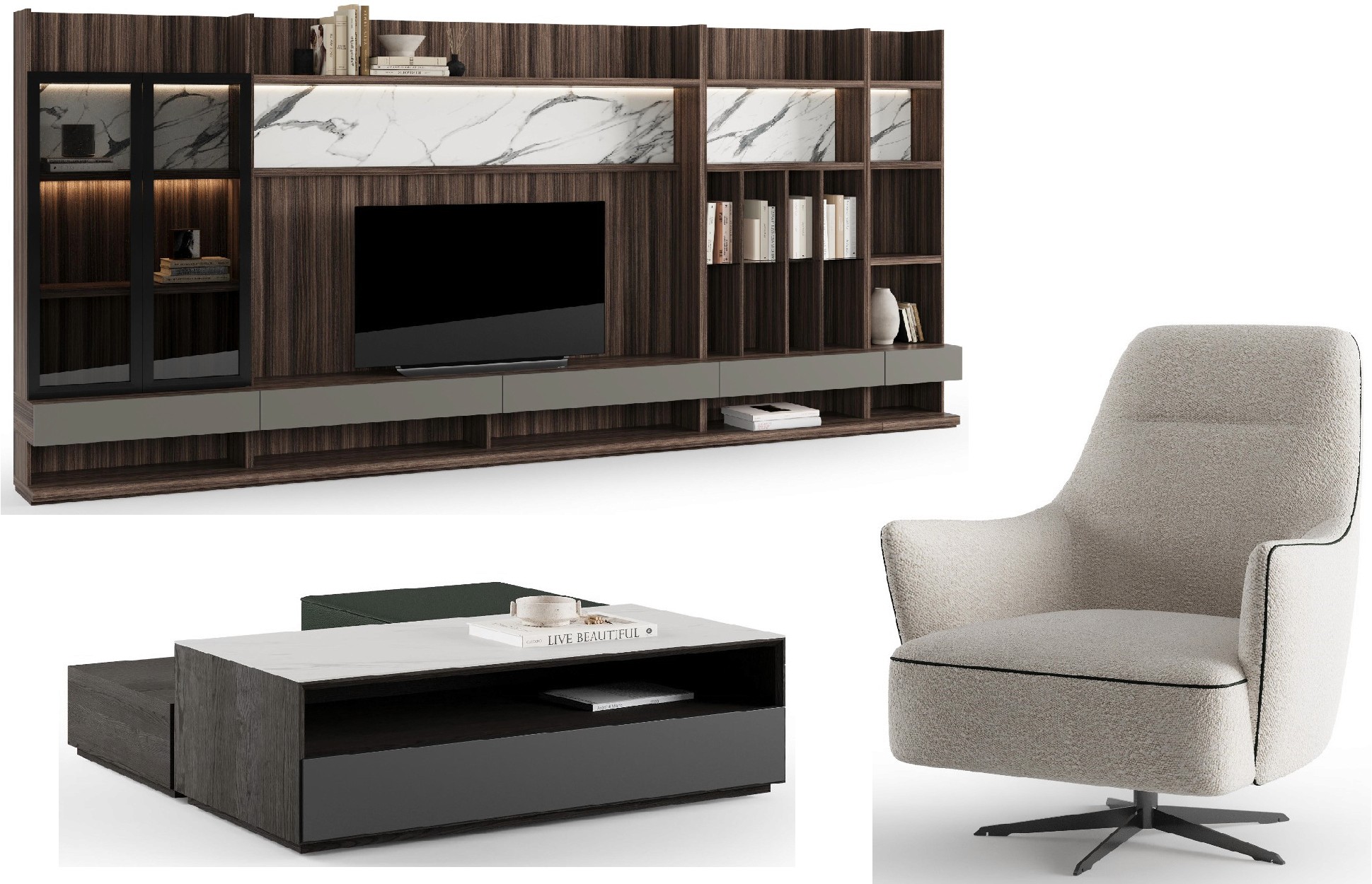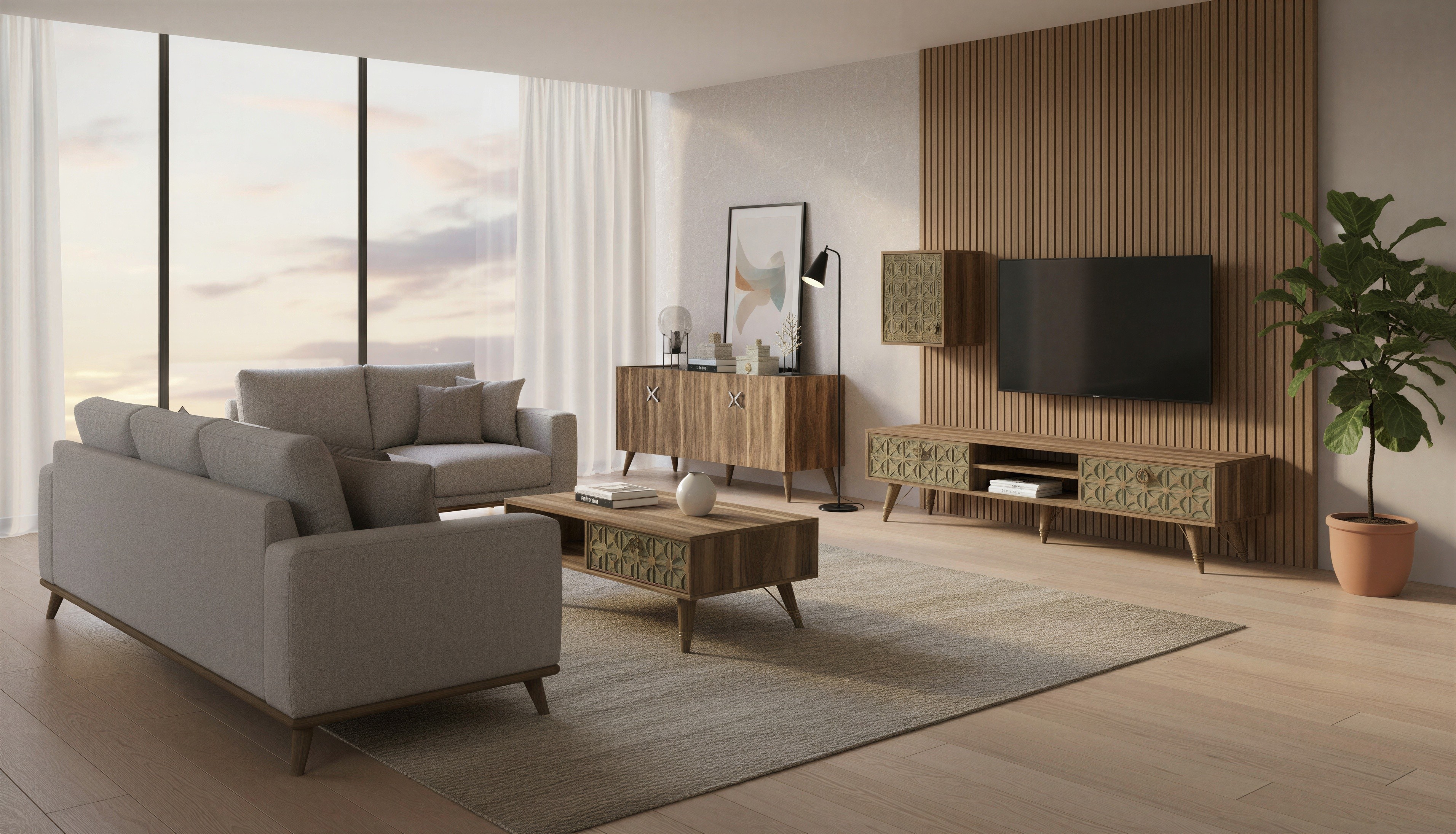 Prompt: Koltuk, orta sehpa ve televizyon ünitesi için e-ticarete uygun görsel oluştur