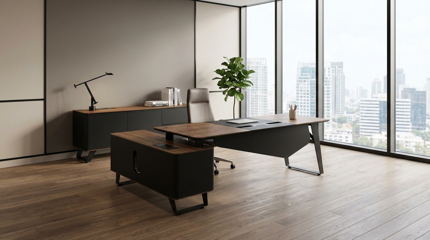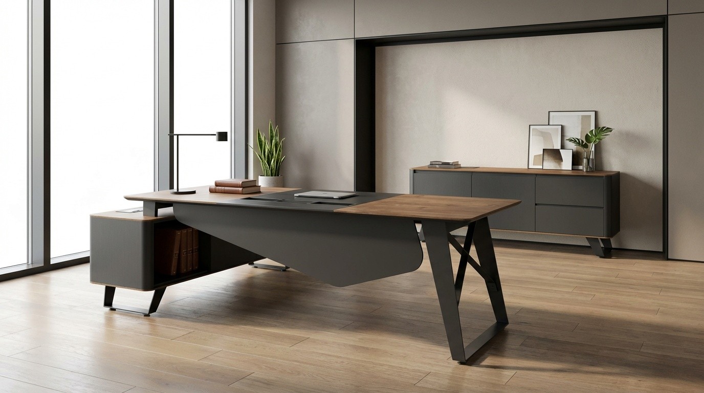 Prompt: Çalışma masası ve dolabını ofis odası içerisinde tek bir görselde sahnelendir
