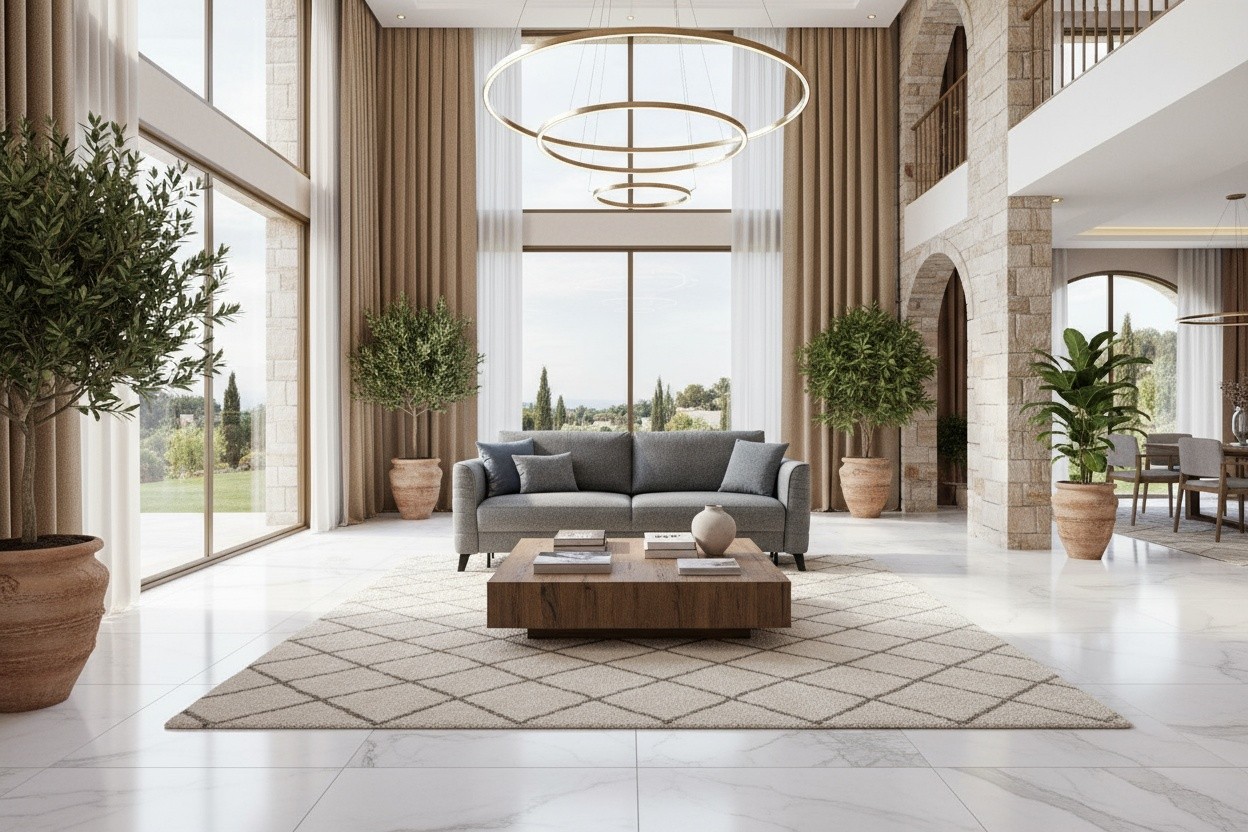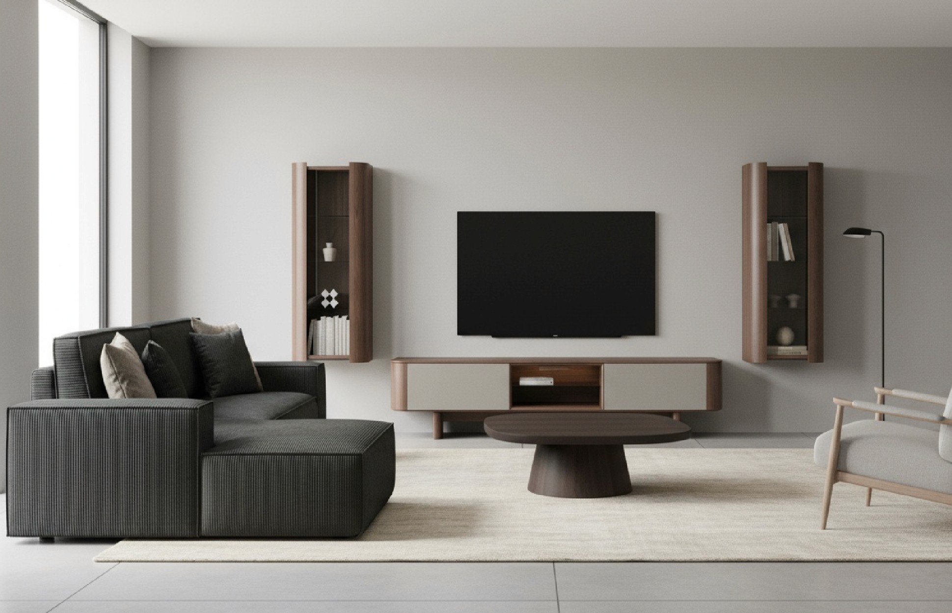 Prompt: Televizyon ünitesi, konsol, orta sehpayı ürünlere uygun bir salonda sahneleme yap