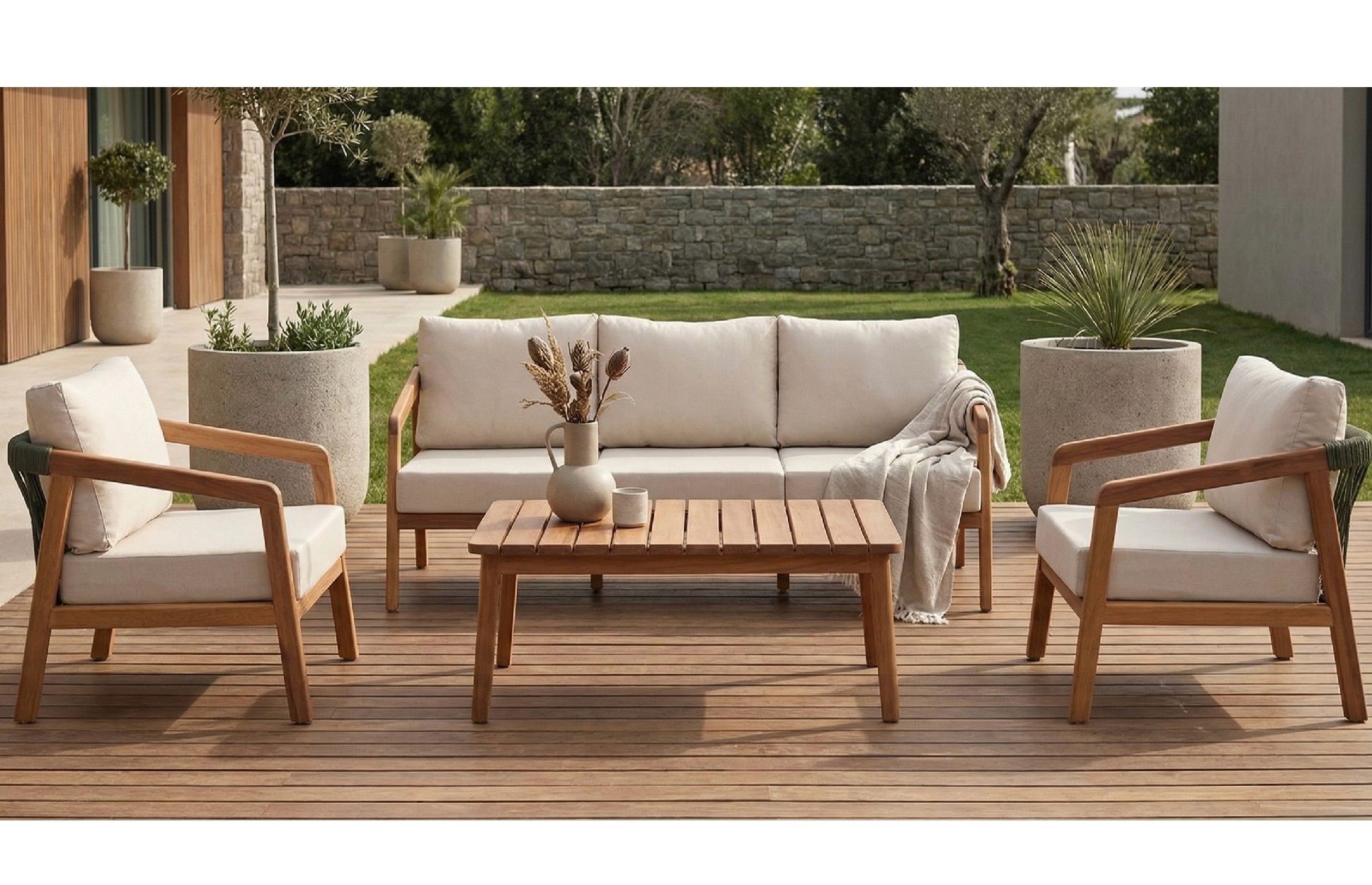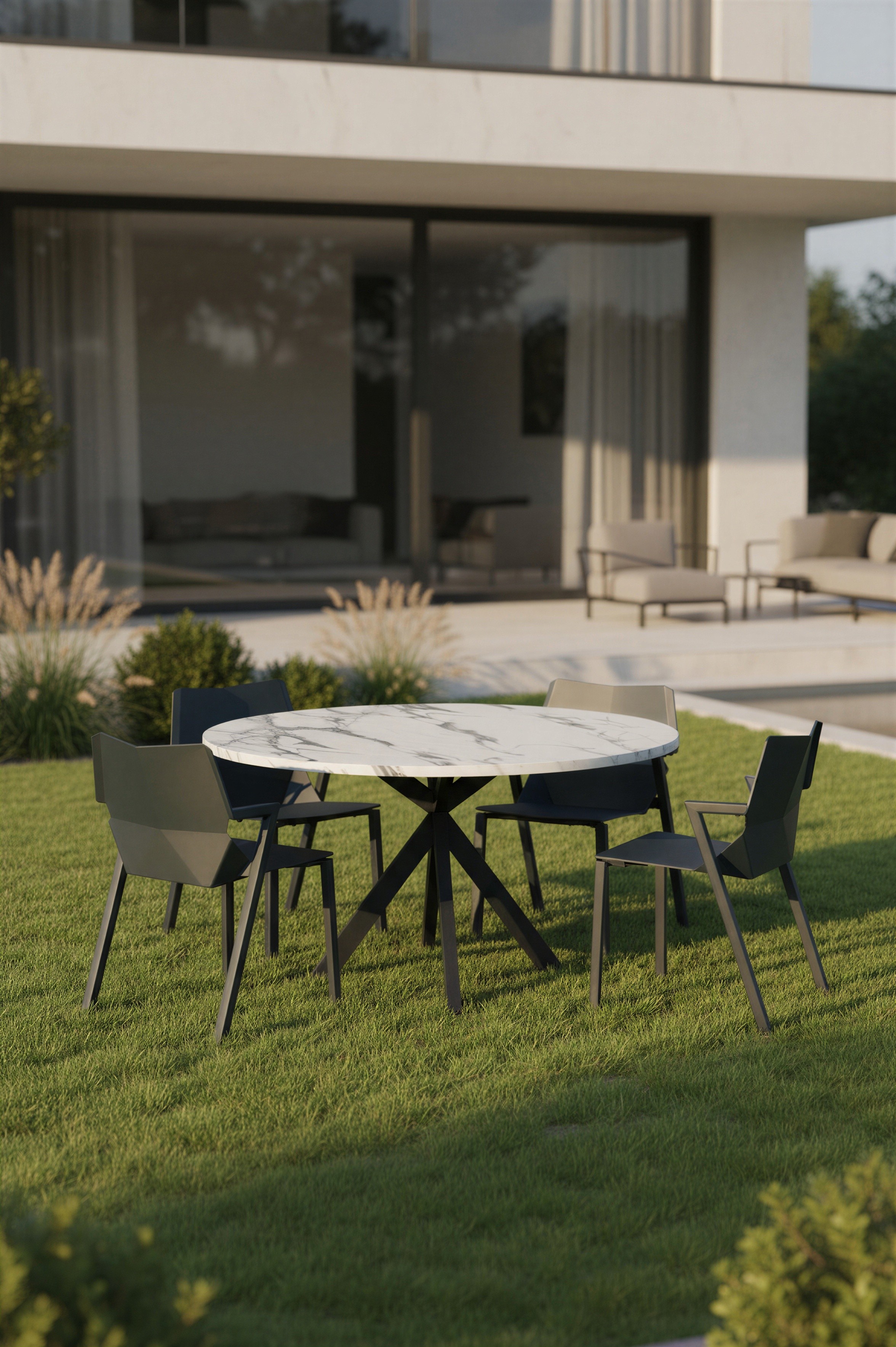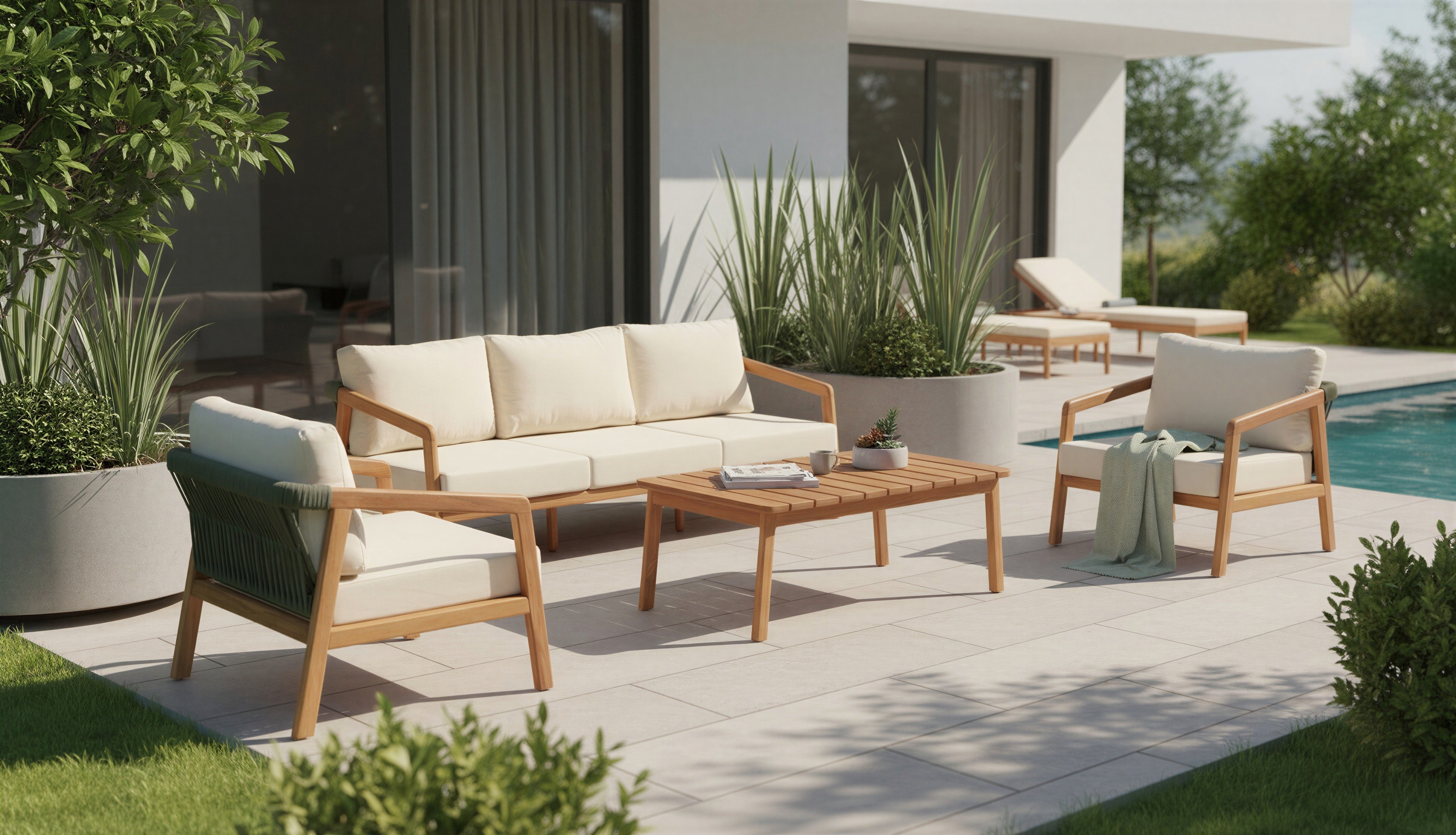 Prompt: Oturma grubunu villanın bahçesinde katalog görseli olacak şekilde konumlandır