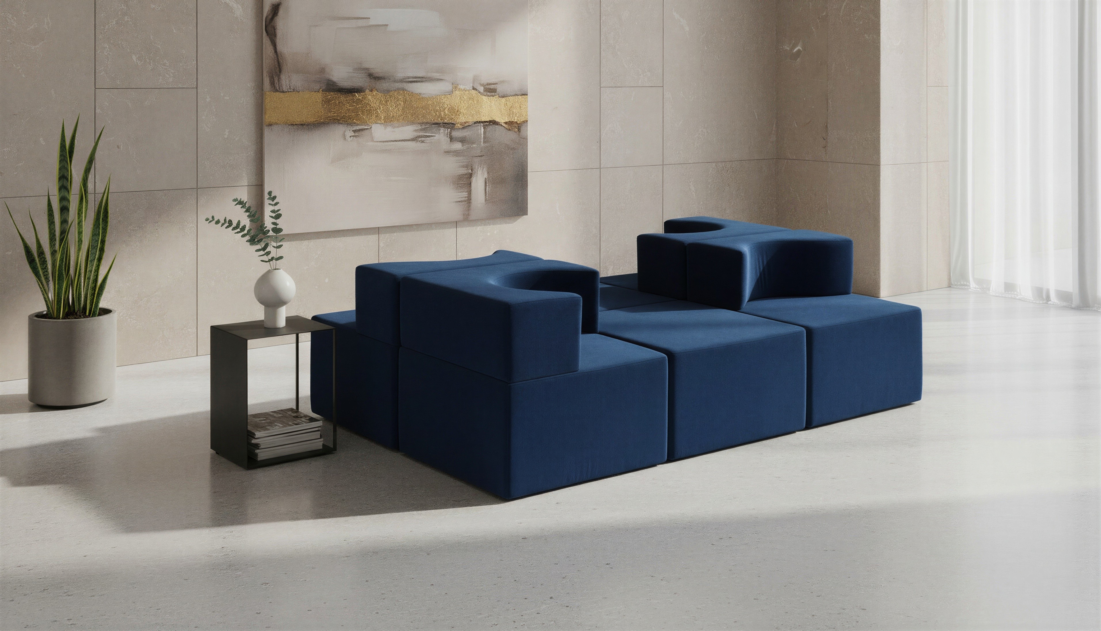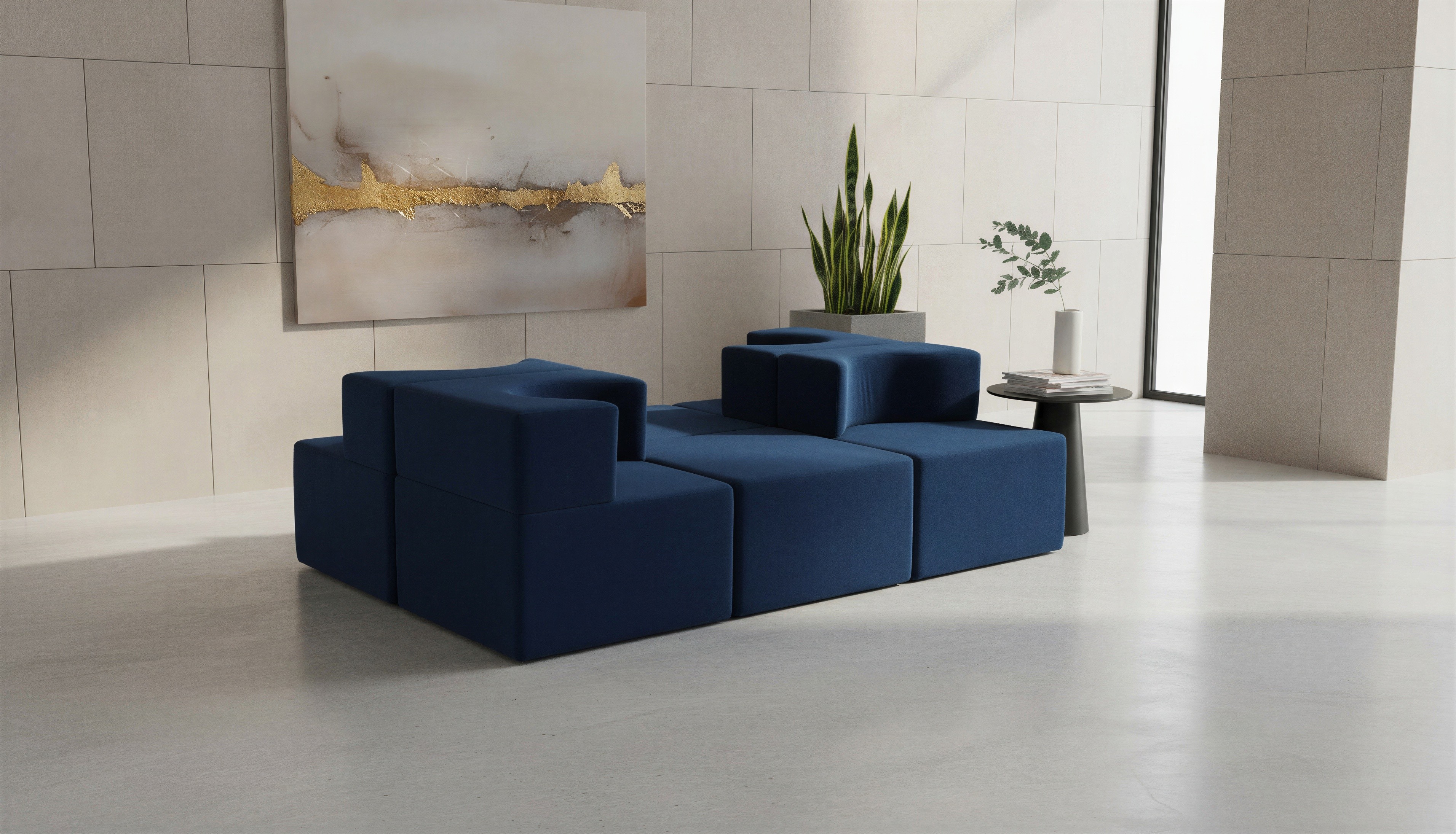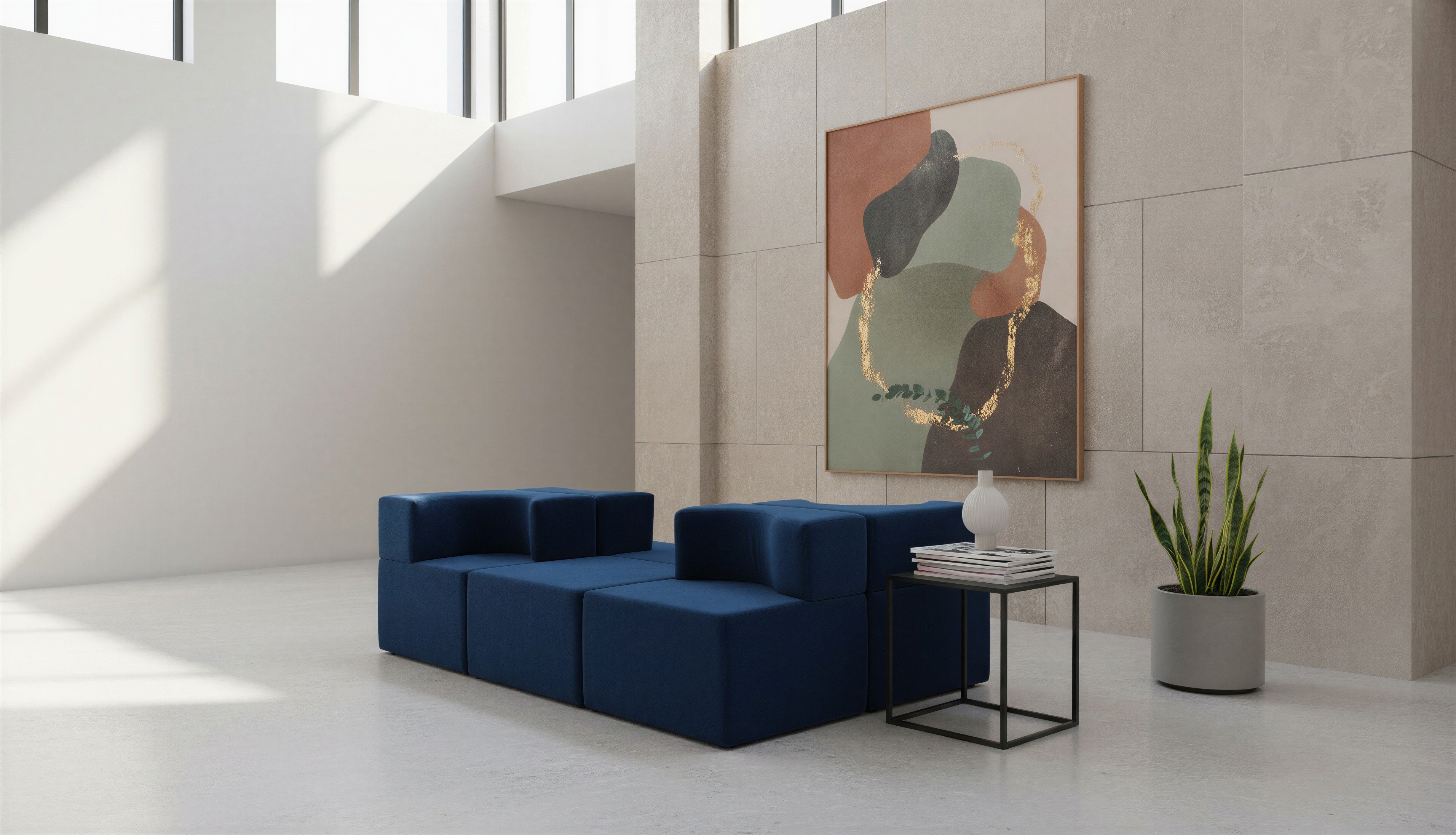 Prompt: Bekleme alanı koltuğunu bir sanat galerinin lobisinde konumlandır.