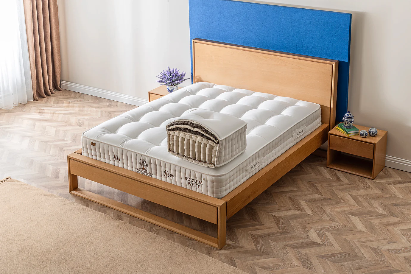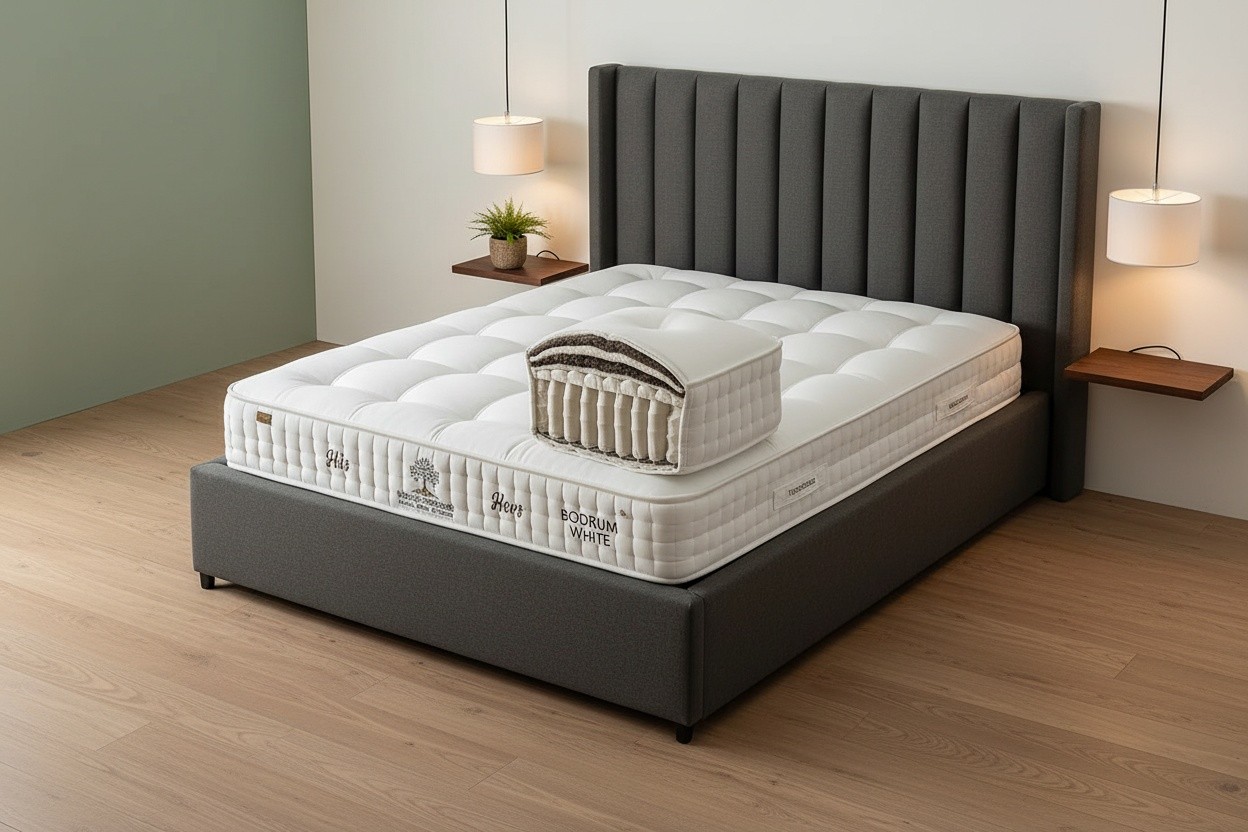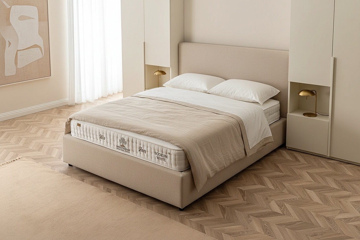 Prompt: Karyolanın üzerinde bulunan yatağı farklı yatak odalarında sahnelendir