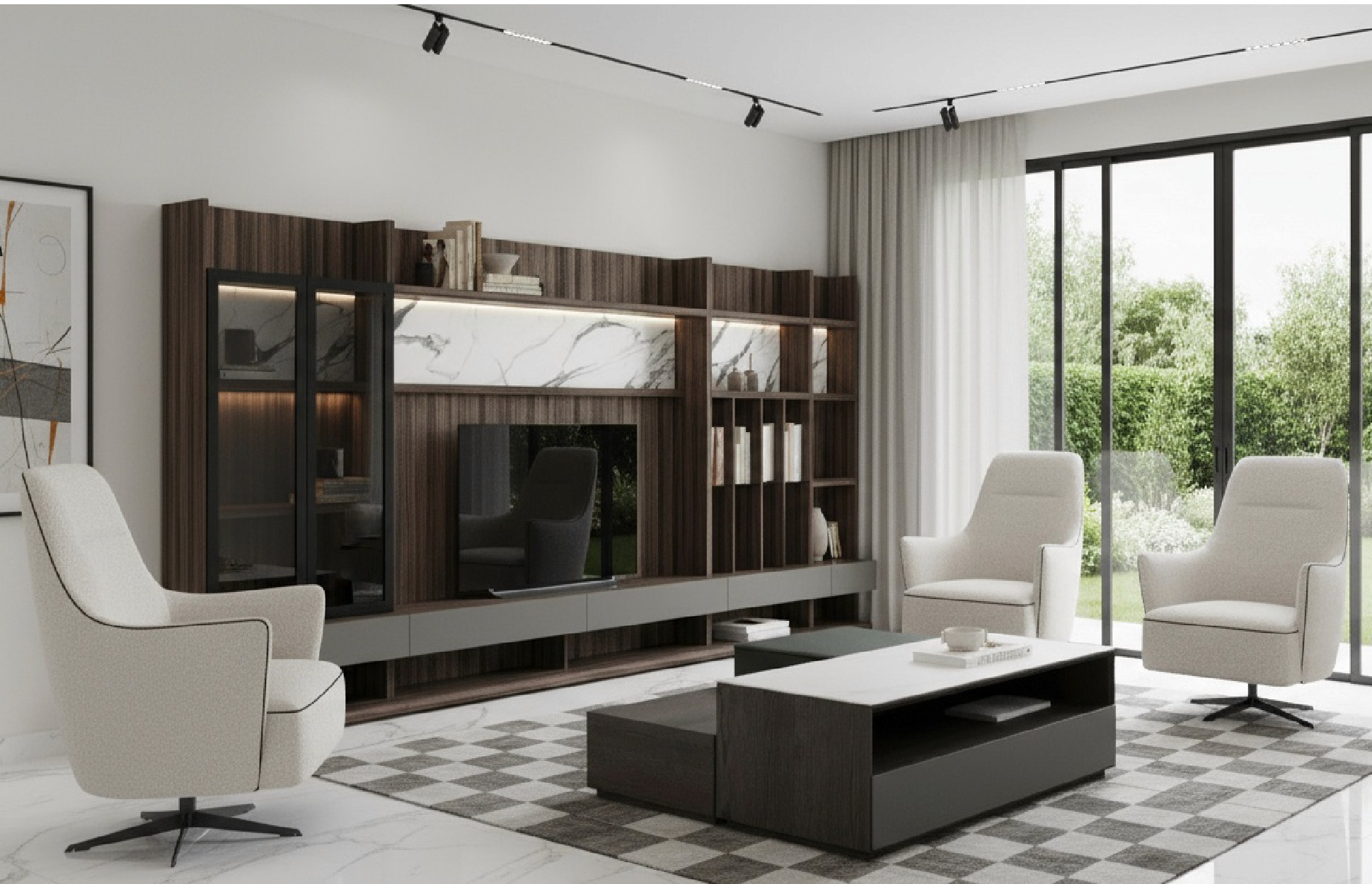 Prompt: Berjer, televizyon ünitesi ve orta sehpayı aynı salon içerisinde sahneleme yap